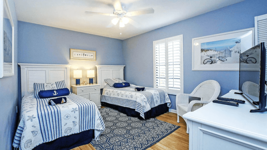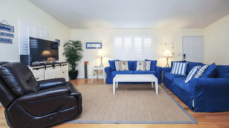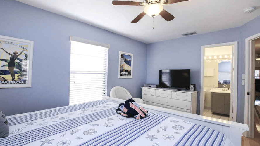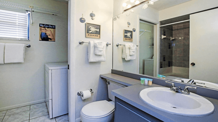The master bedroom has a king size bed, in-room TV and full in suite bathroom. The first of two guest bedrooms both has a queen size bed and in-room TV. The second guest bedroom has two twin beds and TV. The cabana room inside the pool area, has a pull out sofa which sleeps two, a full bath and tables and chairs, a great space for a couple wanting more privacy or teens looking to hang out. Each room is well-appointed with plenty of closet and dresser space. There’s a full bathroom with jacuzzi tub in the hallway across from the guest rooms. An adjoining laundry room has a washer and dryer for your convenience.