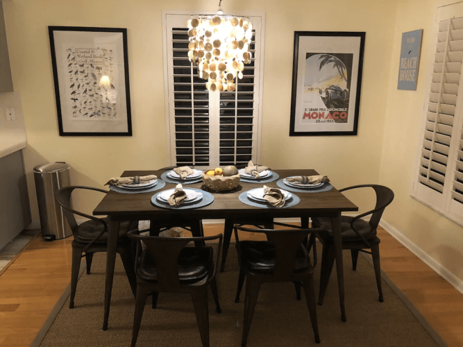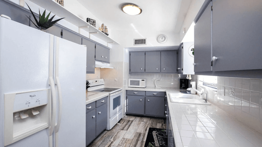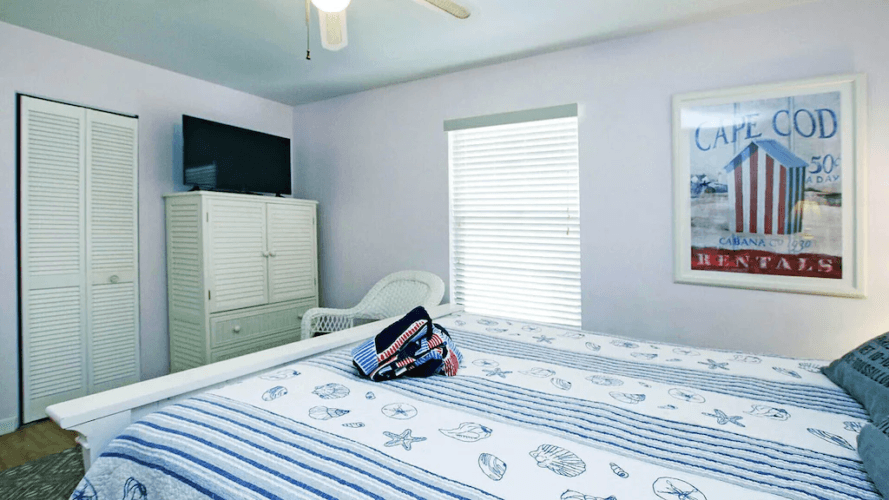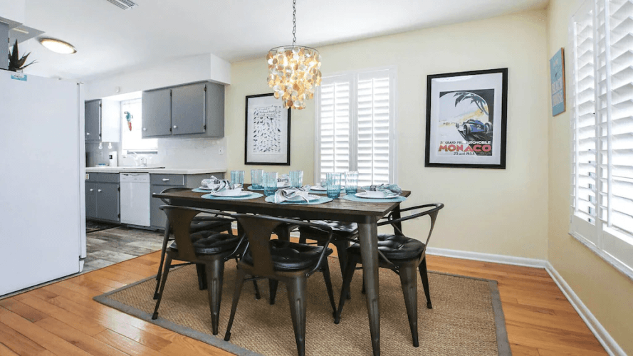 Stepping into the house you will be greeted by an open and inviting living room and dining area. This open dining room complete with a shell chandelier opens up to the comfortable and cozy living room. Decorated in welcoming denim and sunny tones, it is reminiscent of the waters of the Gulf with the sandy beach and sunshine which give you a tropical beach feeling. Open the French doors and let the Gulf breezes flow through the screened in porch and through the house. A love seat and chairs plus dining table with 4 chairs are ready for you to enjoy watching the sunsets from the porch. The fully equipped kitchen is located just off the dining area and has everything you could need during your stay.